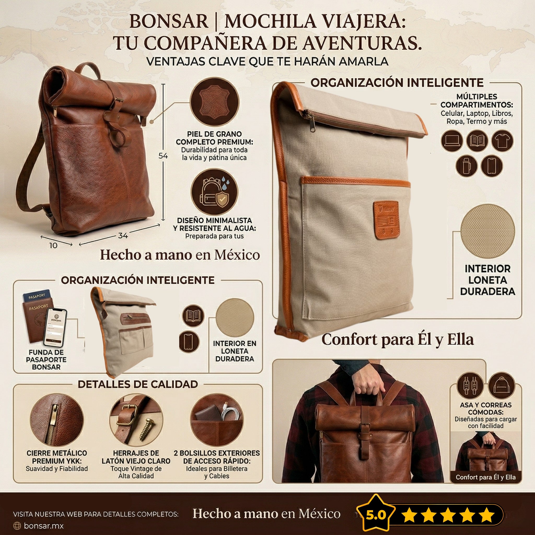 Agrega correa de mano o correa larga de pecho para transportarlo de una manera cómoda. Herrajes premium, cierre metálico YYK,