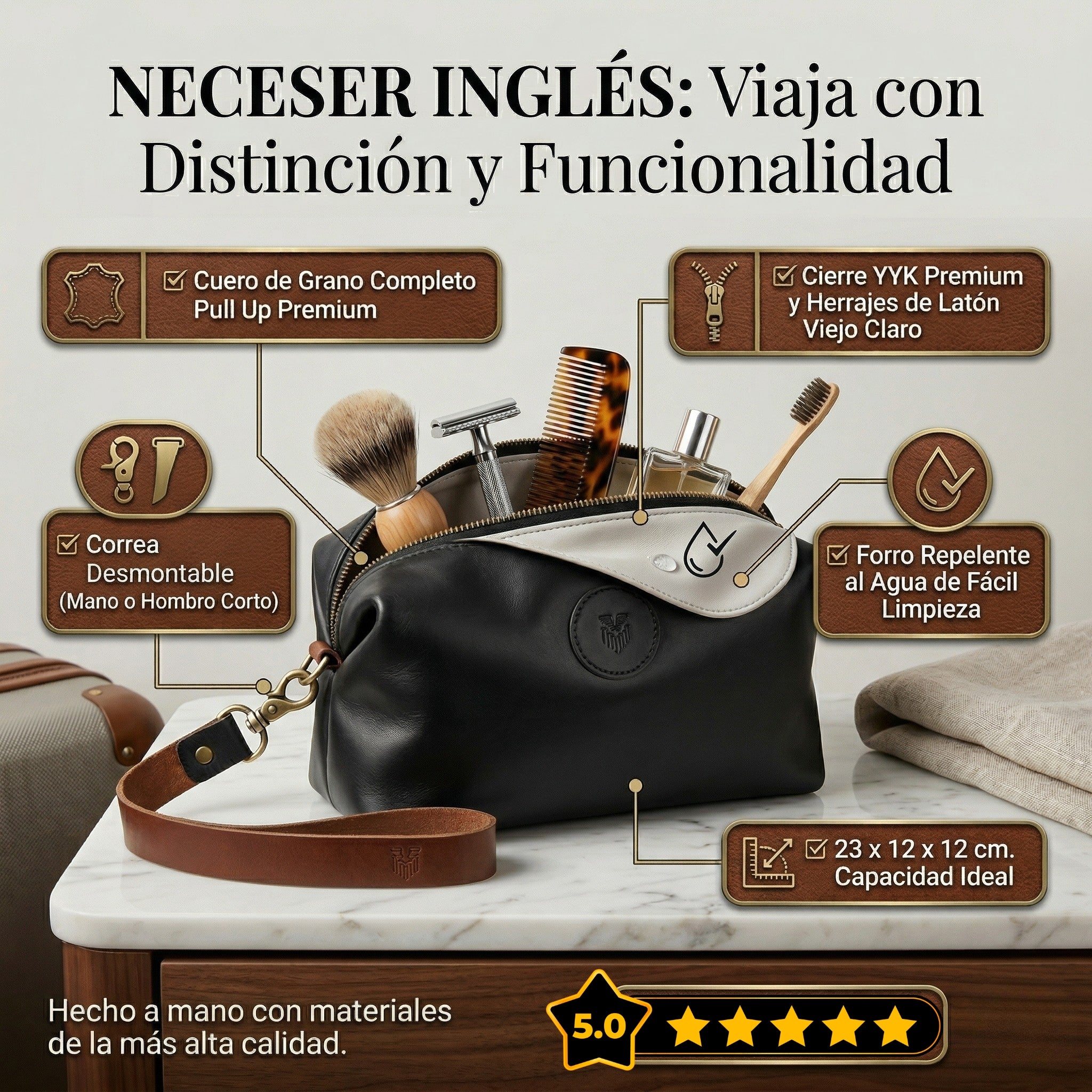 El neceser de piel Ingles ya esta disponible en negro, miel y vino. El perfecto regalo para esa persona especial. Viaja con estilo y presencia a tu destino, con este bolso impactante.
